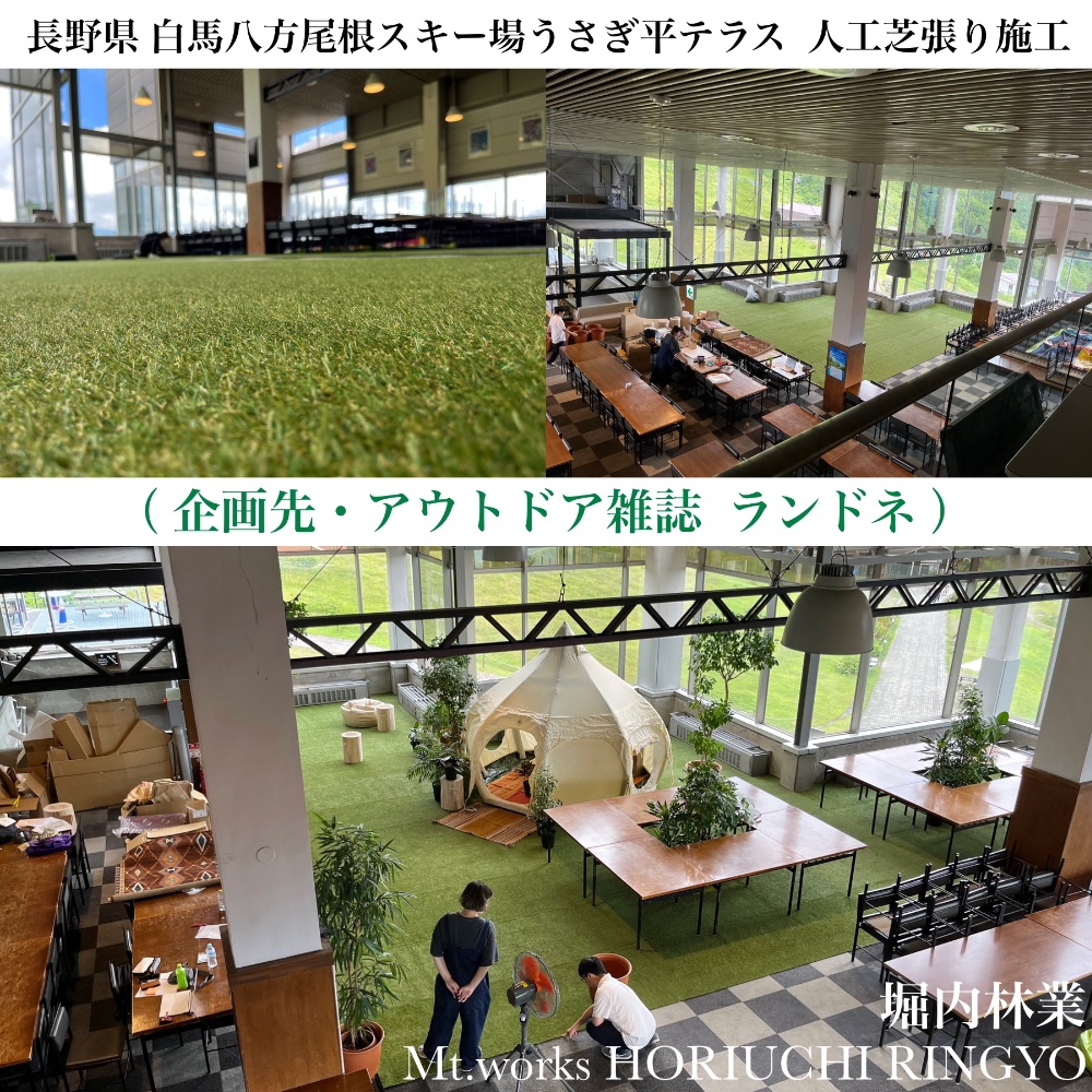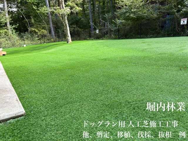 山梨県 富士河口湖町 京王富士スバル高原別荘地内ドッグラン用人工芝施工工事例です。人工芝施工までの剪定、伐採、移植、抜根、整地、芝剥がし、転圧等を行っております。