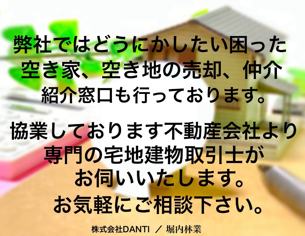 弊社ではどうにかしたい困った空き家、空き地等の売却、仲介、整理、整備等に関する相談、ご紹介窓口も行っております。協業しております不動産会社より専門の宅地建物取引士がお伺いいたします。お気軽にご相談下さい。